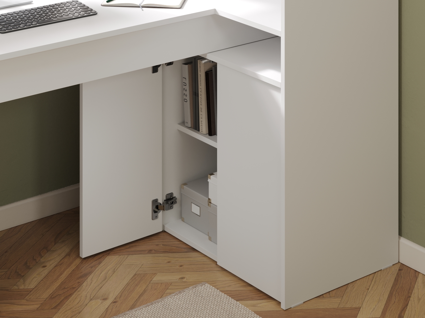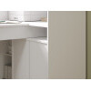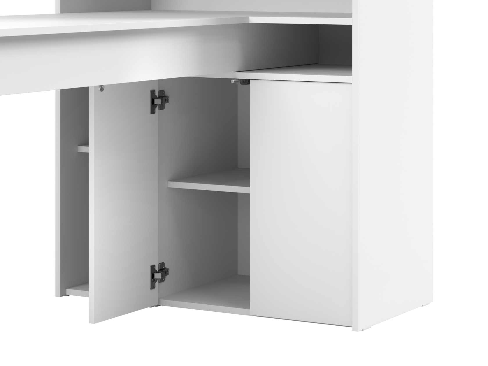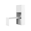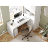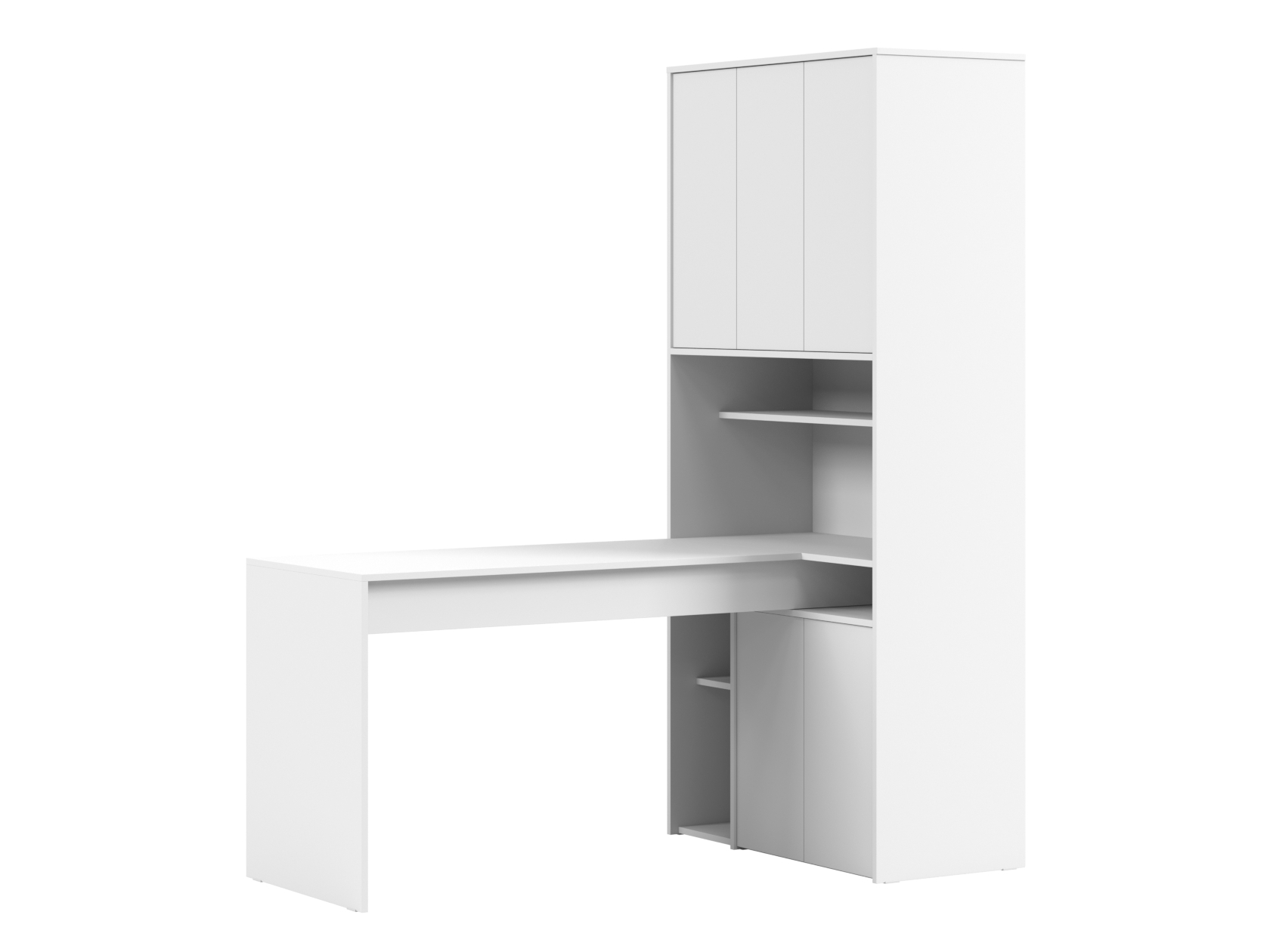 Просторная поверхность дополнена стеллажом и тумбой, что обеспечивает доступ к канцелярским принадлежностям. За распашными дверцами удобно хранить документы, учебники и другую печатную продукцию. В открытых нишах можно установить небольшую оргтехнику или расставить предметы декора.