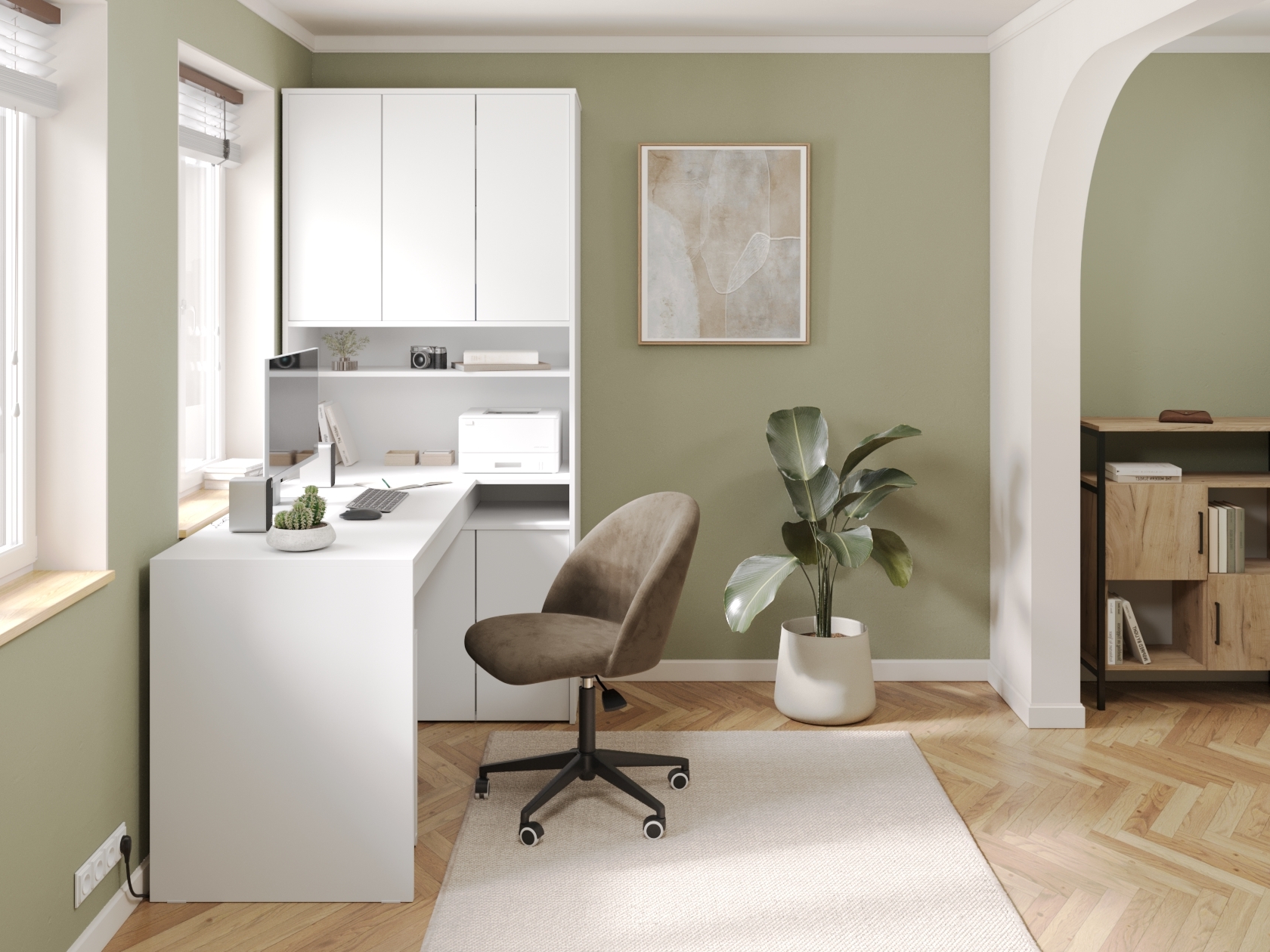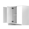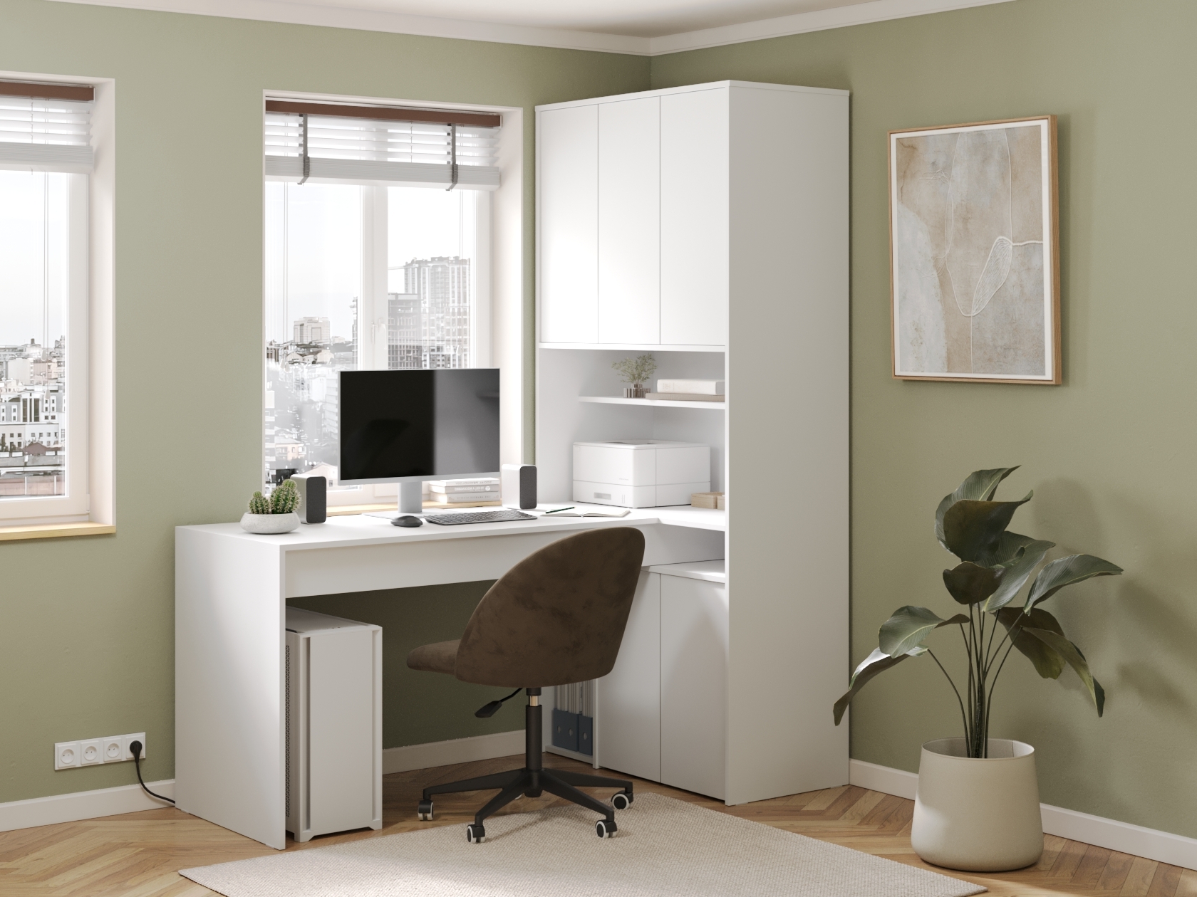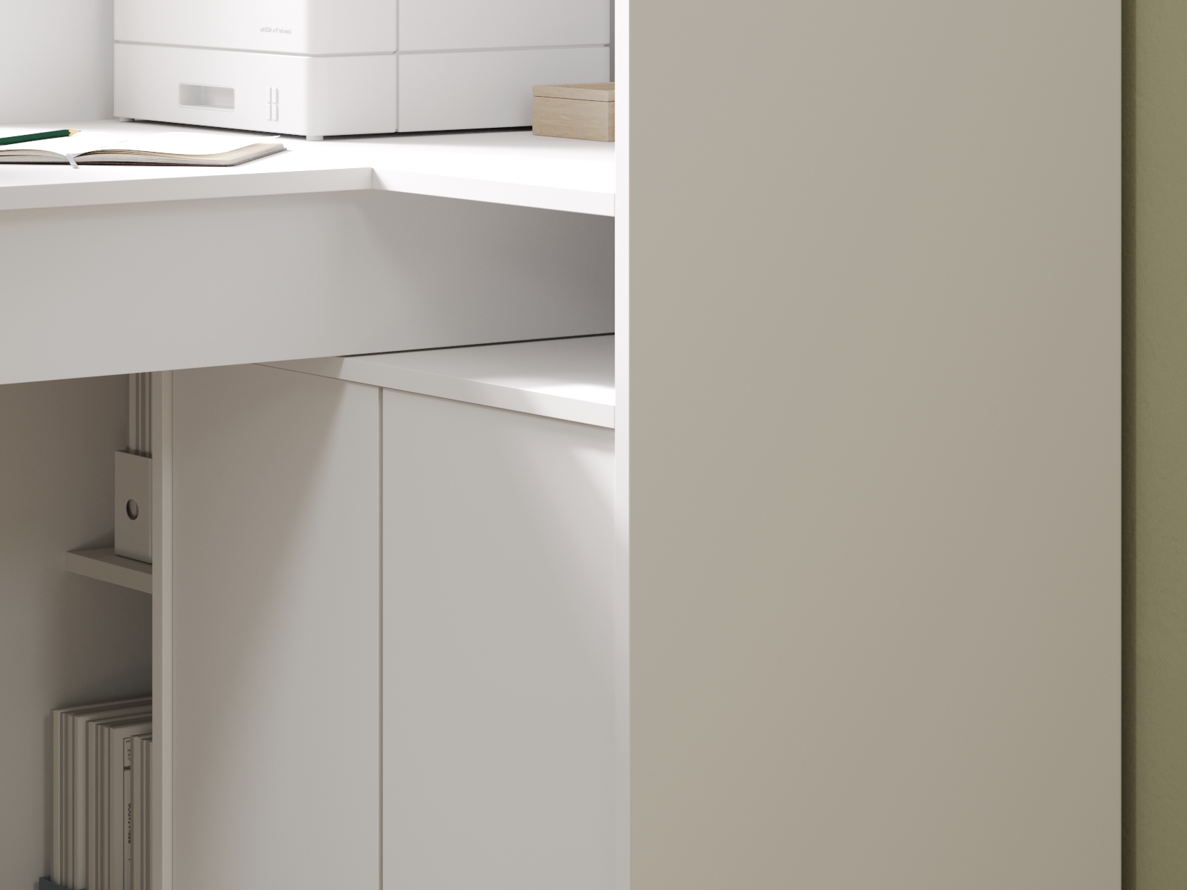 Просторная поверхность дополнена стеллажом и тумбой, что обеспечивает доступ к канцелярским принадлежностям. За распашными дверцами удобно хранить документы, учебники и другую печатную продукцию. В открытых нишах можно установить небольшую оргтехнику или расставить предметы декора.